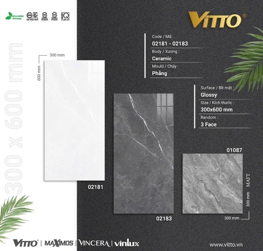 Sản phẩm thuộc thương hiệu VITTO, chất liệu ceramic, kích thước 30×60 cm, độ dày 8 mm. Bề mặt men bóng hỗ trợ tăng cảm giác sạch sẽ, sáng không gian và thuận tiện hơn trong quá trình vệ sinh hằng ngày.