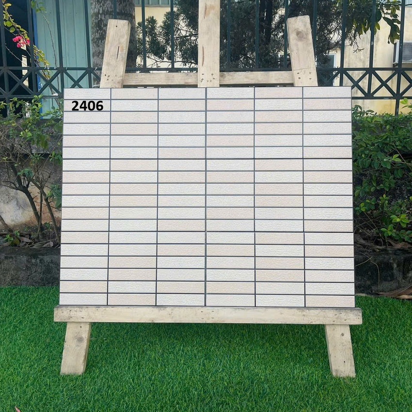 Gạch giả thẻ 2406 tông be kem ấm áp, thiết kế dạng thanh nhỏ giúp không gian mềm mại và sang trọng, phù hợp ốp tường phòng tắm, bếp hoặc mảng trang trí hiện đại.